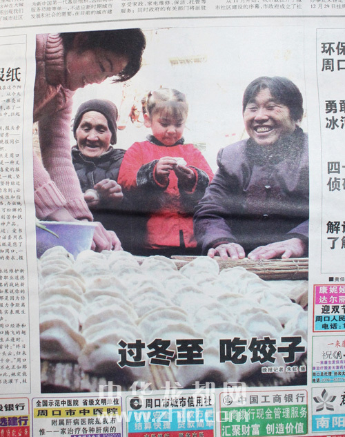 ????創(chuàng)刊號頭版壓軸圖片《過冬至,吃餃子》,拍攝的是80多歲的姥姥、50多歲的媽媽、30多歲的媳婦、五六歲的小女孩四世同堂歡天喜地包餃子的場景。媳婦搟餃子皮,姥姥、媽媽包餃子,五六歲的小女孩也來湊熱鬧,拿起一個餃子皮學(xué)著大人的模樣包餃子,剛剛包好的一大鍋蓋餃子令人垂涎。特別是按照晚報的送報時間,創(chuàng)刊號報紙送到千家萬戶時正好是上午11時之前,此時正是人們包好餃子準(zhǔn)備煮餃子的時間??上攵?,大家一邊品讀屬于周口人自己的晚報、欣賞和諧家庭歡天喜地包餃子的圖片,一邊把包好的餃子下到沸騰的開水鍋里,那煮出的餃子香味和著晚報濃濃的墨香,香飄滿城,沁人心脾。