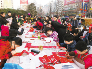 ????② 新春佳節(jié)即將來臨,三川大地處處洋溢著喜慶的氛圍。市區(qū)五一廣場(chǎng),一群愛好書法的小朋友正在為市民義務(wù)寫春聯(lián)。(記者 侯俊豫 攝)