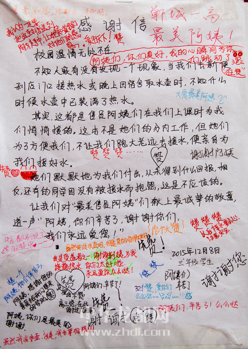 ????不少學(xué)生在這封感謝信上留言表達(dá)敬意和謝意:“贊”、“給個大贊”、“我是受益者之一,謝謝阿姨為我接滿熱水,你們太好啦”、“阿姨們辛苦了”、“謝謝您”……