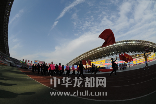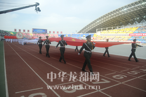 運(yùn)動(dòng)員抬著會(huì)徽入場(chǎng)