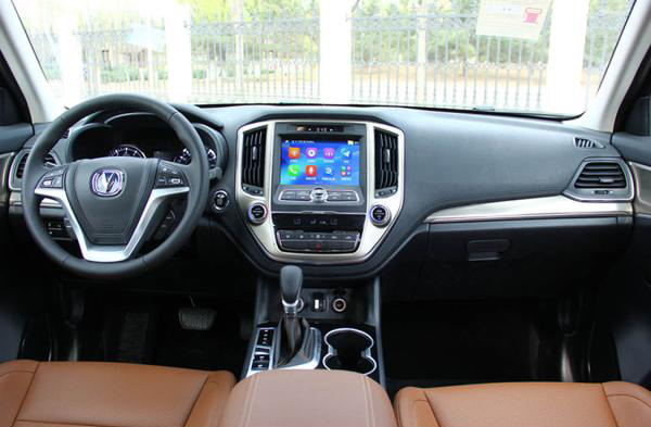 長(zhǎng)安CS95采用大尺寸顯示屏搭配實(shí)體按鍵,兩側(cè)豎向設(shè)置了空調(diào)出風(fēng)口,按鍵排布層次分明,但略顯繁雜。新車還配有三輻式多功能方向盤(pán),門(mén)板以及換擋桿處增加了木紋裝飾,同時(shí)提供5座和7座兩種選擇。