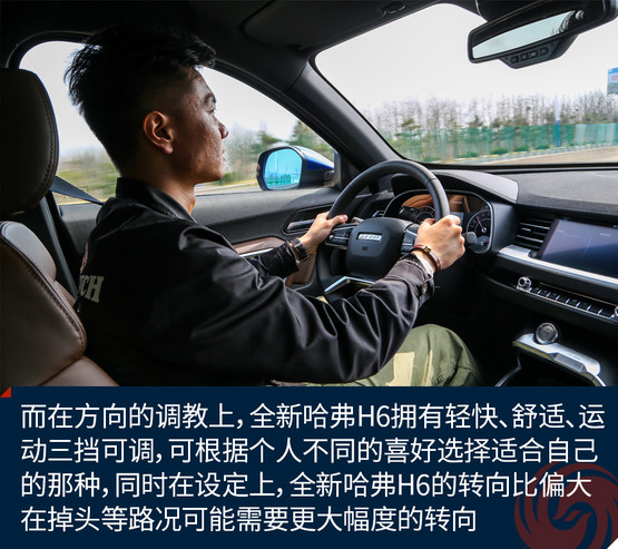 而在方向的調(diào)教上,全新哈弗H6擁有輕快、舒適、運(yùn)動三擋可調(diào),可根據(jù)個人不同的喜好選擇適合自己的那種,同時在設(shè)定上,全新哈弗H6的轉(zhuǎn)向比偏大,在掉頭或者駛?cè)胍恍┍容^刁鉆的小路時可能需要更大幅度的轉(zhuǎn)向。