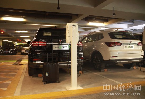 在上海虹橋機(jī)場(chǎng)的停車(chē)樓,由兩排充電樁構(gòu)成的專(zhuān)屬停車(chē)區(qū)甚是醒目,專(zhuān)屬停車(chē)位上的榮威eRX5車(chē)頭標(biāo)志閃爍的呼吸燈表示車(chē)輛正處于充電狀態(tài)。