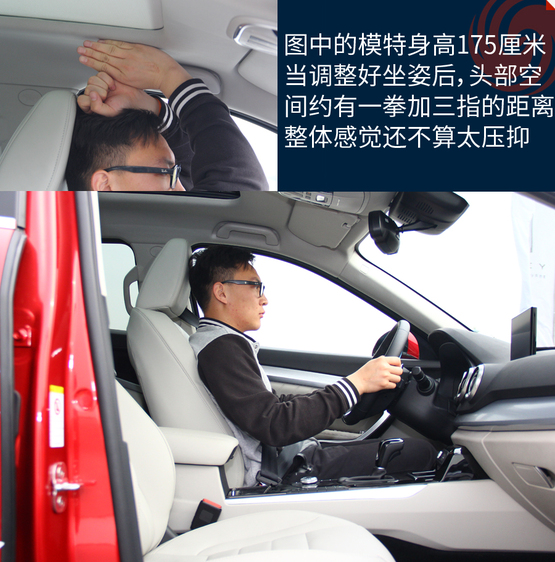 體驗(yàn)者身高175厘米,前排座椅降到最低的時候頭部還有比較充足的余量,完全不會感覺到壓抑;不過后排頭部就不太行了,頭部距離車頂非常接近,要是身高再高一些的乘客坐進(jìn)后排,已經(jīng)基本上快頂?shù)筋^了。儲物空間中規(guī)中矩,基本上沒有太多讓人驚喜的地方。扶手箱的空間不小,高度也合適,可以放些雜物。
