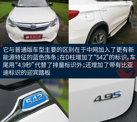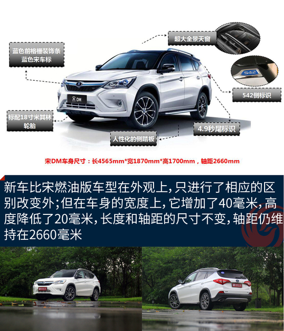 ????????外觀方面,宋DM與燃油版車型基本保持一致,其延續(xù)了X形的前臉造型設計,整個前臉時尚、運動。而在一些細節(jié)上,它與唐100一樣,都有新能源車型專屬的特征,車身D柱處還標有比亞迪“542”標識,并在車尾部標有“4.9s”標識,強調(diào)了該車型的動力系統(tǒng)較為強大。車身尺寸方面,宋DM車型的長寬高分別為4565×1870×1700毫米,軸距為2660毫米。