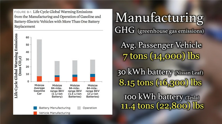 ????????無疑,電池比起傳統(tǒng)內(nèi)燃機(jī)排放的溫室氣體要多的多。普通的內(nèi)燃機(jī)乘用車在生產(chǎn)過程中會產(chǎn)生7噸的溫室氣體排放,而使用30千瓦時電池的日產(chǎn)聆風(fēng)會排放8.15噸溫室氣體。至于100千瓦時電池的特斯拉Model S P100D更是會產(chǎn)生11.4噸的溫室氣體。