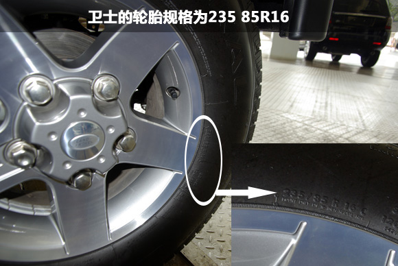 ????衛(wèi)士冰火版的輪胎采用了扁平比厚達(dá)85的輪胎,胎寬為235mm,純粹的越野取向,粗大的輪胎顆粒可以應(yīng)對(duì)野外各種地面條件,依然提供可靠的抓地,但面對(duì)城市中的柏油路面,則不一定能提供良好的抓地。