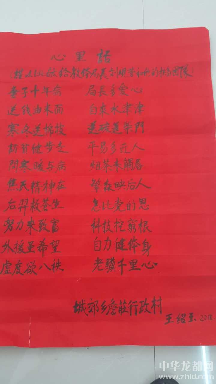 “我推敲了幾個(gè)半夜,寫(xiě)了《心里話——謹(jǐn)以此獻(xiàn)給教體局局長(zhǎng)劉現(xiàn)營(yíng)和他的扶貧團(tuán)隊(duì)》這首五言排律,表表我和老伴及全村對(duì)您的感激之情?!薄捌拮邮瓴?,局長(zhǎng)多愛(ài)心。送錢米油面,自來(lái)水津津。寒冬送棉被,送炭至柴門(mén)。訪貧健步走,平易又近人?!蓖踅B玉聲情并茂地朗讀著,劉局長(zhǎng)爽朗地笑了,“老伴劉桂蘭藥按時(shí)吃了嗎?”“按時(shí)吃了,多虧您,到我家宣講扶貧政策,幫助我聯(lián)系有關(guān)單位,我老伴享受了慢性病醫(yī)保?!薄肮鹛m說(shuō),人家劉局長(zhǎng)隔三差五給咱送米面油,逢年過(guò)節(jié)給咱送慰問(wèn)金,前幾天頂風(fēng)冒雪送來(lái)兩床被子,一年不知來(lái)了多少趟,待咱比親人還親啊!我家也沒(méi)有什么拿出手的,我倆一合計(jì),就發(fā)揮我的一點(diǎn)專長(zhǎng),給您寫(xiě)了首詩(shī),您經(jīng)常去我家噓寒問(wèn)暖,我今個(gè)也來(lái)您這,算是走走親戚吧,回報(bào)回報(bào)您!”