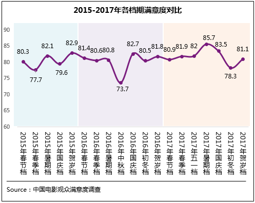 從年內(nèi)調(diào)查的7個檔期來看,除初冬檔以外的其他6個檔期滿意度均進(jìn)入“滿意”區(qū)間(≥80分),其中暑期檔滿意度得分85.7分,居年內(nèi)首位,同時也是自滿意度調(diào)查開展以來的檔期最高分。另外,2017年檔期滿意度的高點(diǎn)和低點(diǎn)較2015年、2016年均有提升。