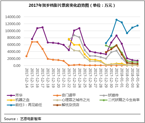 于12月29日上映的國產(chǎn)喜劇IP“前任系列”的第三部作品《前任3:再見前任》整體表現(xiàn)也較優(yōu)異,影片用接地氣的風(fēng)格闡釋愛情與成長的主題,讓人捧腹又直戳人心,滿意度80.7分居檔期第二位;在良好口碑支撐下,影片票房也表現(xiàn)出了逆市上揚(yáng)的巨大潛力。