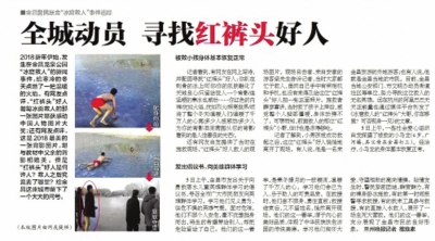 1月3日,中央電視臺(tái)新聞?lì)l道《新聞直播間》欄目報(bào)道此事。一時(shí)間,“紅褲頭”救人的事跡,在金昌市乃至整個(gè)甘肅省引起了強(qiáng)烈的反響。在官方微信平臺(tái)上,有上百條留言,大多是為“紅褲頭”小哥點(diǎn)贊的。不少人希望找到這個(gè)不愿留名的英雄。為此,《金昌日報(bào)》以及當(dāng)?shù)孛襟w紛紛發(fā)起“尋找紅褲頭好人”“尋找冰窟救人的無名英雄”的尋人啟事。