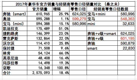 如果以經(jīng)銷商終端零售口徑統(tǒng)計(jì),奔馳(含smart)2017年銷量為624,025輛,其中奔馳品牌(含v級車)為601,195輛;奧迪品牌為599,279輛;寶馬(含Mini)為580,996輛,其中寶馬品牌為548,363輛;如果以經(jīng)銷商終端零售口徑計(jì)算,奔馳品牌(含v級車)在2017年豪華車終端零售市場獲得銷售冠軍。