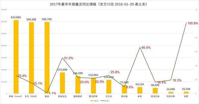 以官方披露的銷量口徑計(jì)算,奔馳(含smart)全年銷量為610,965輛,增長25.9%,成為中國市場首家銷量超過60萬輛的豪華車品牌,銷售總量名列第一;奧迪全年銷量為595,700輛,增長1.1%;寶馬(含Mini)全年銷量為594,388輛,增長15.1%。如果按單一品牌統(tǒng)計(jì),奧迪品牌銷量為595,700輛,寶馬品牌為56萬輛,奔馳品牌(含v級車)為587,868輛,奧迪品牌蟬聯(lián)2017年中國豪華車第一。