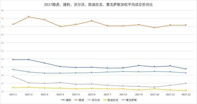 凱迪拉克、捷豹路虎、雷克薩斯、沃爾沃四個(gè)品牌銷量在10萬輛以上為第二陣營。除路虎外,捷豹因進(jìn)口F-pace帶動其成交價(jià)上揚(yáng),隨著XE國產(chǎn)上市銷售,捷豹銷量有望進(jìn)一步增長,價(jià)格進(jìn)一步下探;以銷售進(jìn)口車型為主的雷克薩斯,今年銷量質(zhì)量不錯(cuò),庫存時(shí)間短,資金周轉(zhuǎn)快,多數(shù)以訂單方式銷售,加權(quán)平均價(jià)在42萬上下,成交價(jià)格走勢平穩(wěn),經(jīng)銷商今年利潤也很豐厚。沃爾沃在新款車型的帶動下,成交價(jià)格開始上揚(yáng);凱迪拉克今年銷量增速較快,通過下圖我們可以看到,凱迪拉克基本依靠低價(jià)獲取銷量的增長,成交價(jià)格進(jìn)一步走低,經(jīng)銷商的利潤需要依靠廠家補(bǔ)貼。
