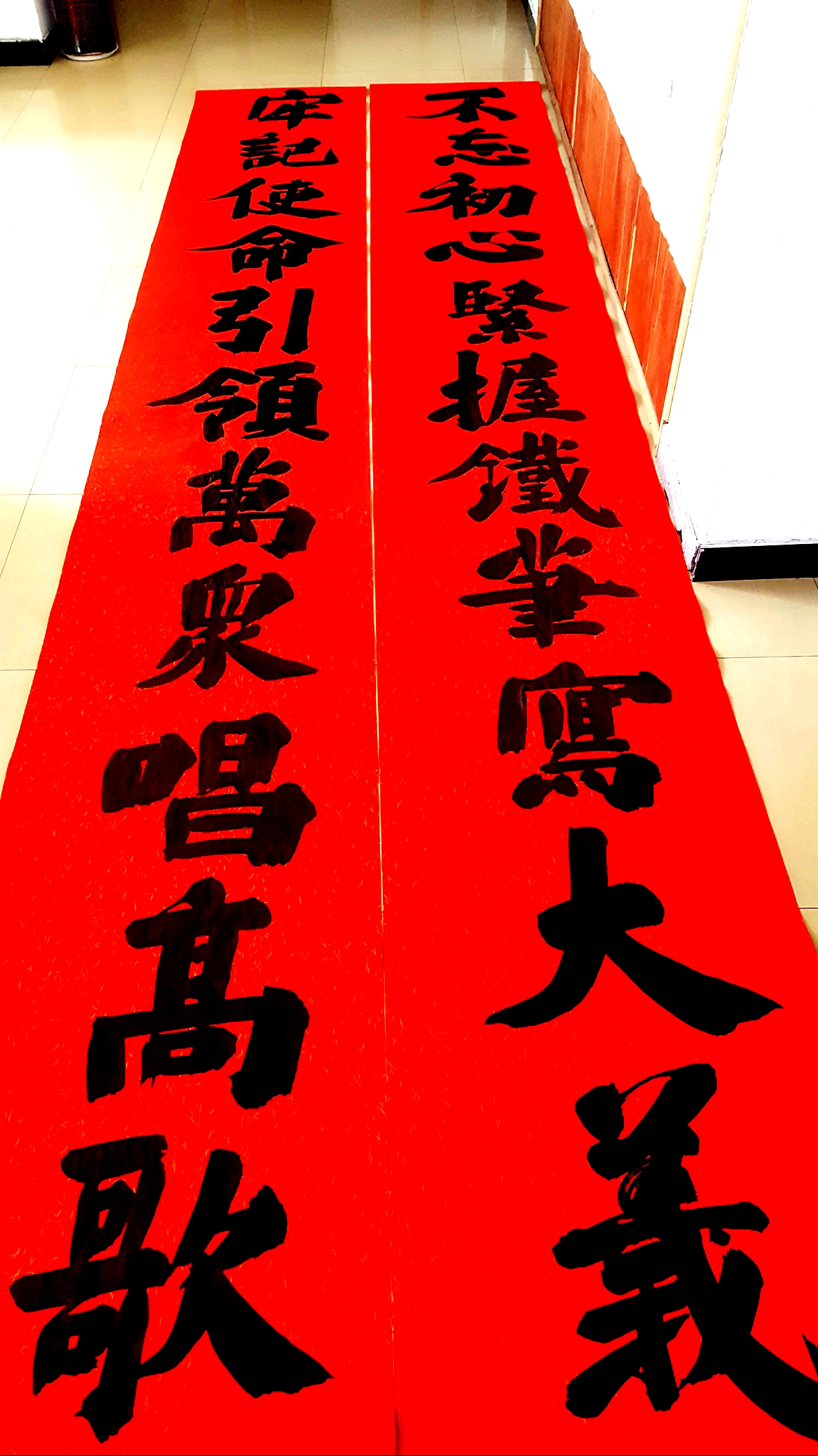 邢懷章以歐陽(yáng)通筆法融合魏碑,大楷榜書創(chuàng)作而成,春聯(lián)長(zhǎng)達(dá)5米,每字徑80公分左右,一氣呵成,不計(jì)工拙,近兩個(gè)小時(shí)完成兩幅巨型春聯(lián),表達(dá)了對(duì)周口報(bào)業(yè)集團(tuán)的祝福,映出了喜慶的年味。