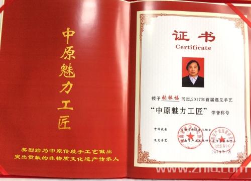 經(jīng)2017首屆中原魅力工匠評(píng)審工作委員會(huì)認(rèn)真初評(píng)、終評(píng)、綜合打分,最終張振福泥塑作品《老來(lái)伴》在推選活動(dòng)中榮獲“金獎(jiǎng)”。張振福等27位藝術(shù)家榮獲“中原魅力工匠”榮譽(yù)稱號(hào)。張振福作為民間藝術(shù)家代表在頒獎(jiǎng)典禮上作了唯一的典型發(fā)言即“獲獎(jiǎng)感言”。