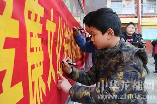 中華龍都網(wǎng)訊(周口報業(yè)全媒體記者 韋偉 通訊員 王佳佳 辛曼 攝)今年是毛澤東“向雷鋒同志學(xué)習(xí)”題詞55周年。3月5月,沈丘縣紀(jì)委監(jiān)委聯(lián)合縣義工聯(lián)走進沈丘二高、河南小學(xué),開展“孝廉文化進校園”活動,旨在弘揚雷鋒精神和“孝善儉廉”的美德。圖為:學(xué)生們在“弘揚雷鋒精神,做‘孝善儉廉’美德少年”條幅前簽字。