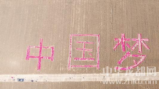 記者在現(xiàn)場看到,“中國夢”三個字每個字高約30米,寬約23米,間隔約10米,筆畫寬約2米。為了讓字跡突出,他們把以前懸掛宣傳標(biāo)語的廢棄紅布條,鋪在麥茬上。一片金黃中,紅艷的字體格外奪目。