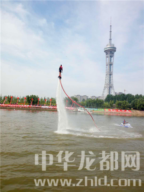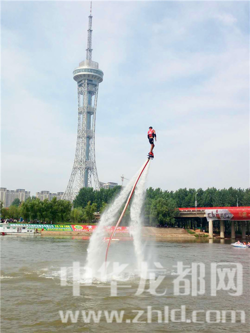 開幕式上,大賽組委會(huì)請(qǐng)來的“水上飛人“表演令觀眾驚嘆不已,只見一名運(yùn)動(dòng)員腳下踩著特制的噴水裝置,猶如鋼鐵俠一般,從水中騰空而起,時(shí)而在半空中靜止不動(dòng),時(shí)而從空中飛魚入水,連續(xù)做出前后空翻、空中回旋、蛟龍出水等各種華麗特技,令觀眾尖叫雀躍。期間,水上兩艘快速疾飛的船模表演,以及空中翻飛自若的航模表演,都給觀眾帶來了不一樣的視覺感受。