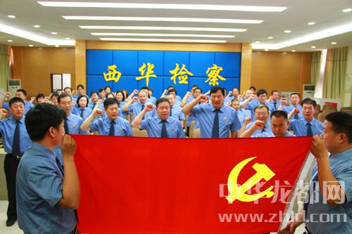 中華龍都網(wǎng)訊(周口報(bào)業(yè)全媒體記者 竇娜 通訊員 屈琳琳)“我志愿加入中國(guó)共產(chǎn)黨,擁護(hù)黨的綱領(lǐng),遵守黨的章程,履行黨員義務(wù),執(zhí)行黨的決定……”6月28日,面對(duì)鮮紅的黨旗,西華縣人民檢察院副檢察長(zhǎng)、黨支部書(shū)記劉新建帶領(lǐng)全體黨員高舉右手,重溫入黨誓詞。
