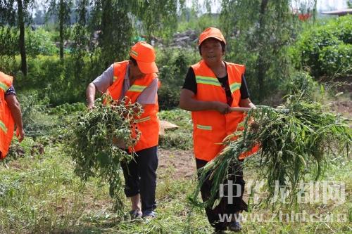 “蒿草長(zhǎng)得比人都高,拔都拔不掉,鐮刀都割斷了好幾把了,只能徒手拔?!备浇迕窠溆?duì)記者說,她和同伴們從早上5點(diǎn)多就開始在這兒除草了,雖然又熱又累,但能為城市美化做點(diǎn)貢獻(xiàn)也很高興。