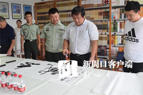 為進(jìn)一步充實(shí)官兵的警營(yíng)文化生活,喜迎建軍91周年,7月30日下午,周口市青年書(shū)法家協(xié)會(huì)會(huì)長(zhǎng)李為等人走進(jìn)東新區(qū)消防大隊(duì),現(xiàn)場(chǎng)揮毫潑墨,用飽蘸感情的書(shū)法作品向消防官兵表達(dá)了節(jié)日祝福。