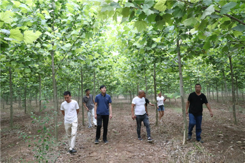 與前廟相鄰的大張村,是一個“天然大氧吧”。從大張村走出來的曹紅星在鄭州從事園林綠化多年,在朱口鎮(zhèn)黨委、鎮(zhèn)政府的支持和鼓勵下,他以1000元/畝的價格流轉(zhuǎn)了1000多畝土地,種植法桐、欒樹、國槐等綠化樹。有著豐富經(jīng)驗的曹紅星在種植綠化樹的同時,積極發(fā)展林下經(jīng)濟,在綠化樹下種植紅薯、大蒜等,有效提高了土地的利用率,經(jīng)濟效益顯著提高。“平時,綠化林地除草、抗旱、施肥需要用工,收種紅薯、大蒜等也需要用工,用工時貧困戶優(yōu)先。只要有勞動能力,來這里就能掙錢?!辈芗t星說,林業(yè)經(jīng)濟的快速發(fā)展為鄉(xiāng)親們脫貧致富提供了保障。