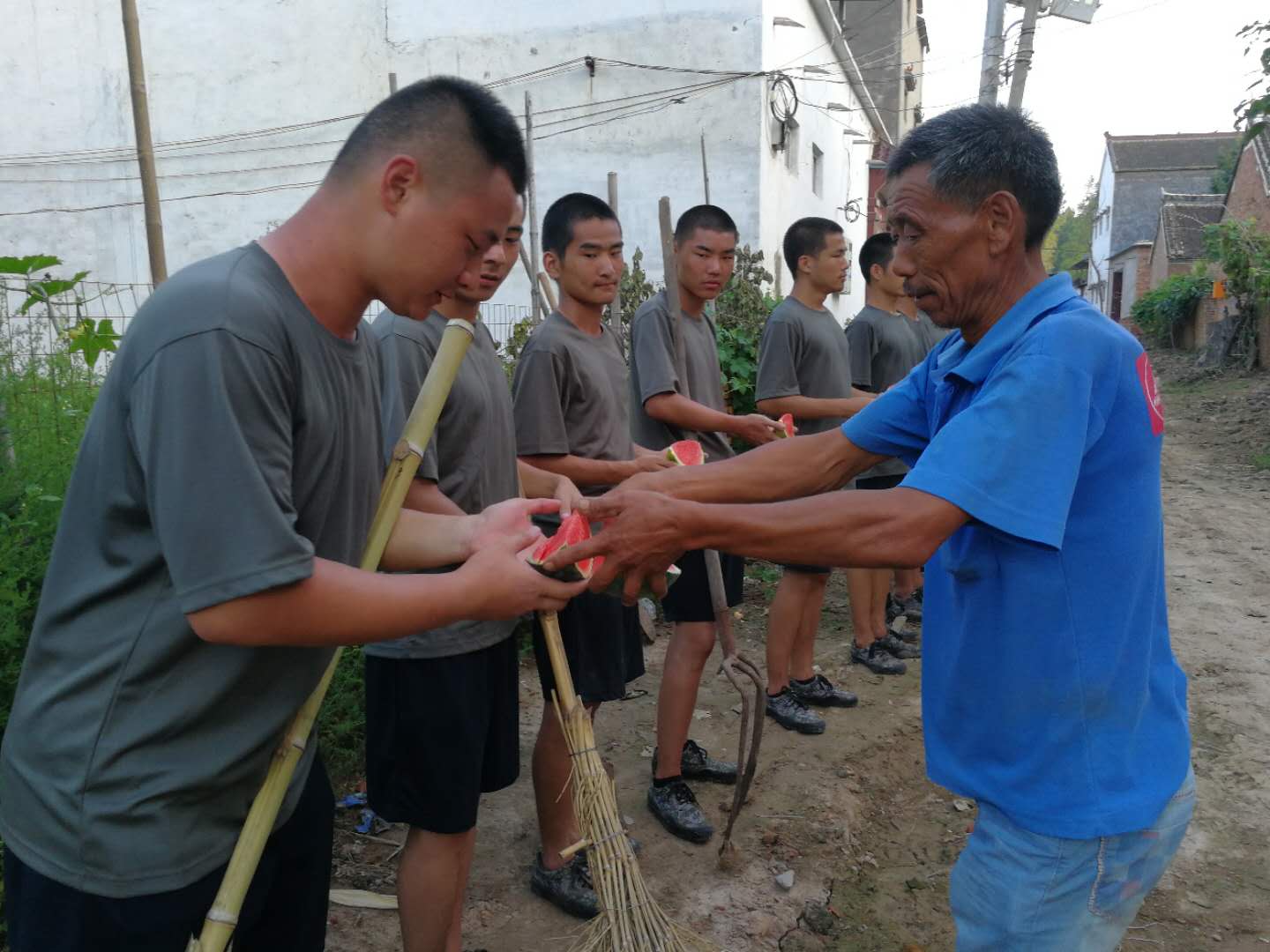 此次活動(dòng)深受鄉(xiāng)親們的贊賞和歡迎,有的老鄉(xiāng)拿出自家的勞動(dòng)工具,與我們 “小戰(zhàn)士”一起勞動(dòng),有的送來(lái)礦泉水和西瓜慰勞正在勞動(dòng)中的“小戰(zhàn)士”,展現(xiàn)出了一幅軍愛(ài)民、民擁軍,軍民魚(yú)水情深的畫(huà)卷。