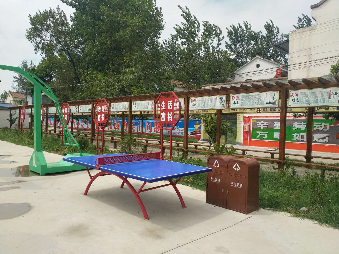在近2000平方米的文化廣場上,南側聳立著高高的旗桿,上方五星紅旗迎風飄揚;北側一字排開牽引器、漫步機、 健騎機、扭腰器等健身器材,五六位鶴發(fā)童顏的老年人正樂呵呵地鍛煉;東側設立的籃球架、乒乓球臺正等待放學的孩子前來玩耍;西側新設的木排廊成了村民休閑聊天的好去處。村黨支部書記郝道杰稱,前一段,有村民提出,健身后累了缺少休息的地方。在征求群眾意見的基礎上,他們設置了這個木質排廊。
