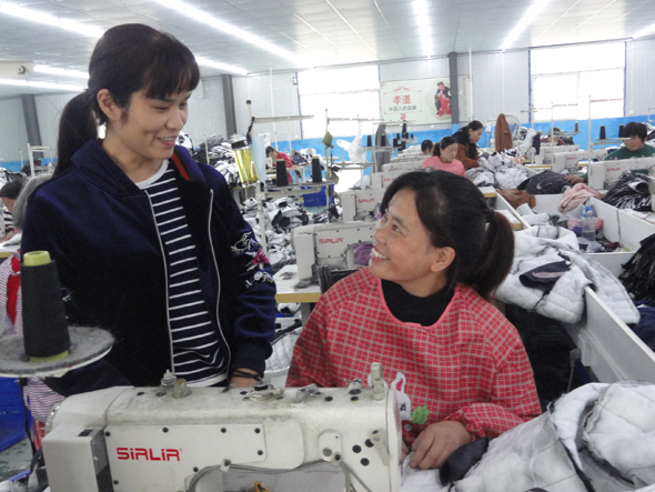 10月20日,商水縣黃寨鎮(zhèn)草樓村“返鄉(xiāng)創(chuàng)業(yè)標(biāo)兵”、鎮(zhèn)人大代表梁艷麗(左)向留守婦女李霞了解生產(chǎn)情況。5年前,梁艷麗和丈夫田新田從溫州打工返鄉(xiāng)后在鎮(zhèn)人大、工商聯(lián)和扶貧辦的幫助下投資200萬元?jiǎng)?chuàng)建巧姑制衣有限公司,下設(shè)3個(gè)制衣廠和1個(gè)扶貧車間,安排當(dāng)?shù)?00多名留守婦女和30名貧困戶婦女就業(yè)。