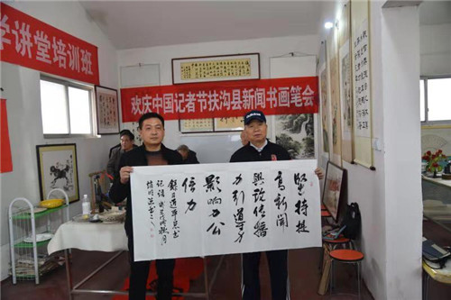 筆墨寫春秋,重彩頌佳節(jié)。為慶祝第19個中國記者節(jié),在扶溝縣的張坡詩詞名人書畫館,來自省書法家協(xié)會的書法家與當(dāng)?shù)匦侣勑麄鞑块T的書畫愛好者們齊聚一堂,以舉行書畫筆會的形式向新聞媒體人慶賀節(jié)日。