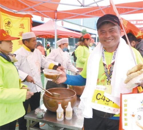 提起周口,“周口胡辣湯”可謂聲名在外。此次馬拉松賽事,主辦方為了讓選手品嘗到周口香辣可口的胡辣湯,特意將周口4家不同口味的胡辣湯“端”到比賽現(xiàn)場(chǎng),讓很多跑友過了一把胡辣湯癮。圖為參賽選手品嘗胡辣湯。記者 張志新 攝
