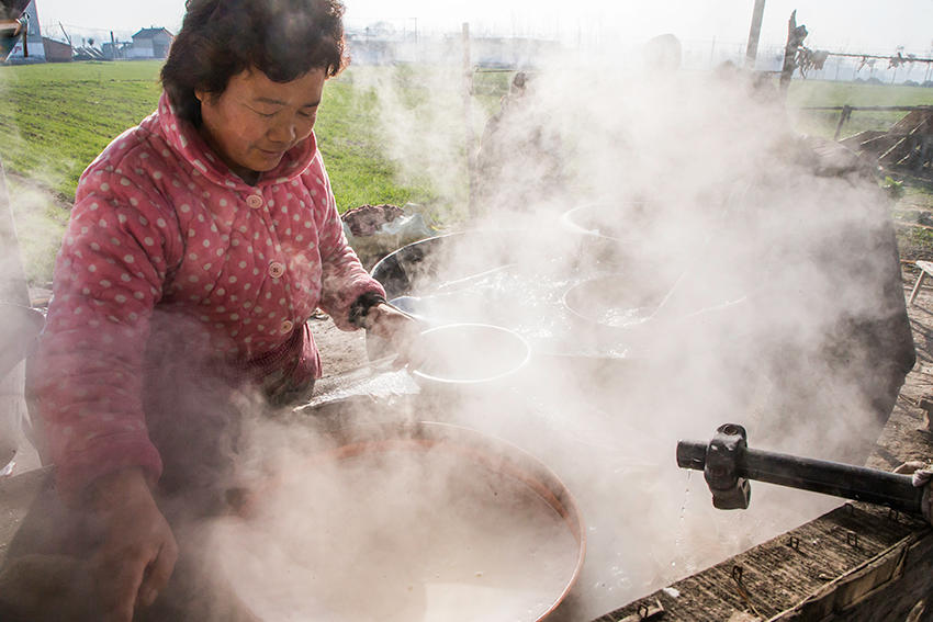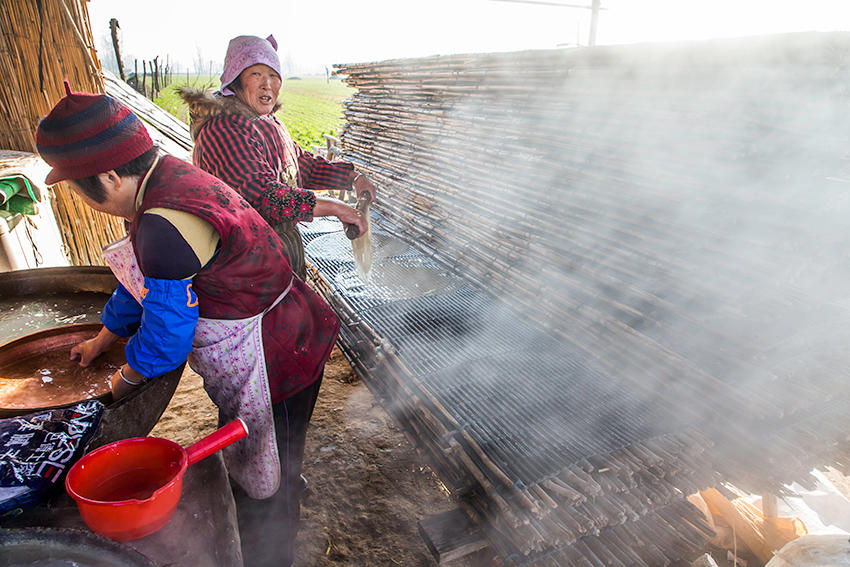 寒冬,河南省沈丘縣付井鎮(zhèn)楊莊村子里,一個(gè)個(gè)制作粉皮的工棚里爐火正旺,熱氣騰騰的大鍋里漂出一張張粉皮。田野中,到處是晾曬粉皮的場(chǎng)景,真是難得一見。