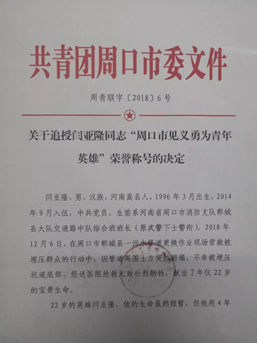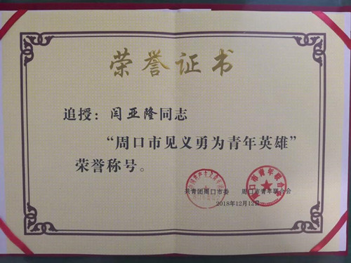 閆亞隆同志被追授“周口市見義勇為青年英雄”榮譽稱號