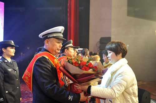 晚會現(xiàn)場,頒獎環(huán)節(jié)和文藝節(jié)目輪番呈現(xiàn),精彩紛呈。由32個民警子女上演的情景劇《天之大》,警寶們用稚嫩的聲音唱出了警察家庭的付出和他們對父母的愛,讓現(xiàn)場觀眾流下感動的淚水;最后一個頒獎環(huán)節(jié),當15名警嫂手捧鮮花獎杯走上舞臺為他們從警10年、20年、30年的愛人頒獎時,整個舞臺愛意濃濃。
