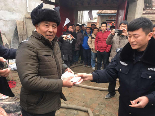2月17日下午3時許,鄲城縣南豐鎮(zhèn)徐寨行政村徐大莊一村民使用地鍋后忘記滅火發(fā)生火災(zāi),鄲城縣公安局一村一警張振偉冒險進入火中,幫助轉(zhuǎn)移出1萬元現(xiàn)金和重要證件。