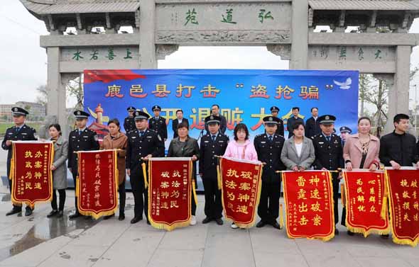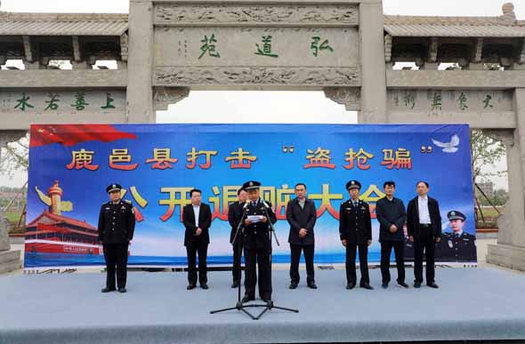 4月25日上午,鹿邑縣召開打擊“盜搶騙”專項行動公開退贓大會。縣委常委、政法委書記侯自峰出席會議并講話??h公、檢、法、司等有關(guān)部門負責(zé)人與群眾代表近300人參加退贓大會。
