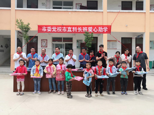 5月29日上午,2019年度市委黨校春季市直科長班20多名學(xué)員代表,在該校副校長高鵬帶領(lǐng)下,來到西華縣大王莊鄉(xiāng)東孫莊小學(xué)開展愛心助學(xué)活動,為48名小學(xué)生送去圖書、書包、文具盒等“六一”禮包。
