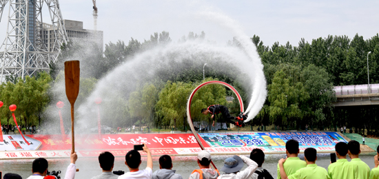 水上飛行器表演是觀賞性較高的水上表演之一,俗稱水上“鋼鐵俠”,是一項由外國人發(fā)明的水上摩托表演項目,兩人一組,一人駕駛摩托艇,一人在水面表演。飛行器的動力主要來自于摩托艇,靠一根水管連接在摩托艇的噴射口,通過摩托艇的噴射動力把人沖起來,最高能達到10米。表演者要在空中完成各種花樣動作,這對表演者的平衡及身體協(xié)調(diào)能力要求很高。