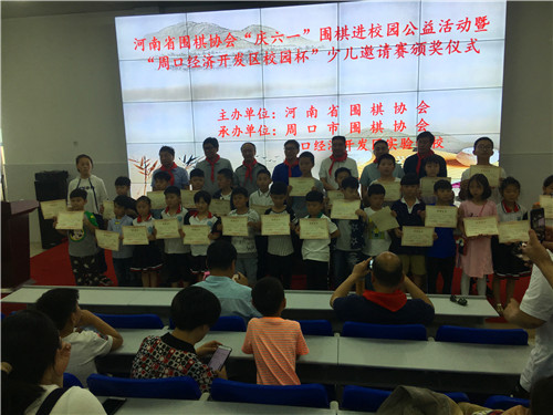 活動中,來自我市各地的百余名圍棋小選手們齊聚一堂,切磋棋藝,以特殊的方式慶祝六一兒童節(jié)。省圍棋協(xié)會向周口經(jīng)濟開發(fā)區(qū)實驗學校捐贈了小學生圍棋教材、圍棋題集等圍棋書籍和器具。
