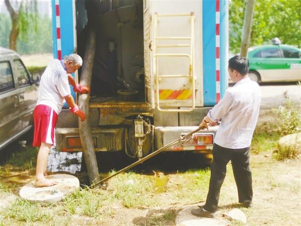 站在公廁旁的污水邊,該負責(zé)人指揮專門處理糞液的車輛到達現(xiàn)場,并就該公廁的情況向記者進行說明?!斑@個公廁是由市園林處負責(zé)修建的,建好投入使用的時候就沒有鋪設(shè)污水管道,只配套了一個能容納9立方米污水的化糞池。因為附近有小廣場,健身的市民多,公廁使用的頻率高,一個化糞池不夠用,我們又增加了一個能夠容納10立方米污水的化糞池,定期進行清理?!痹撠撠?zé)人說。