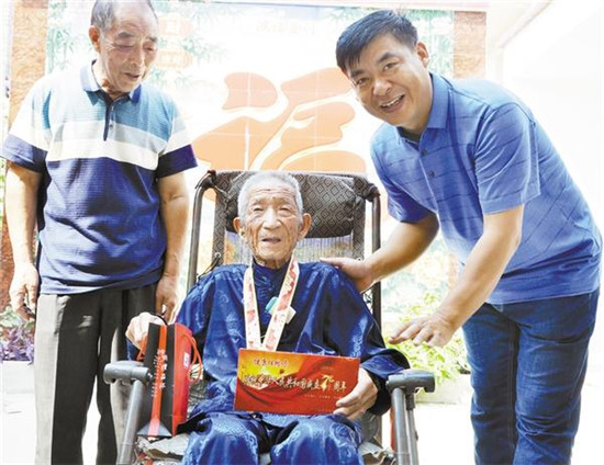 9月26日,商水縣退伍軍人事務(wù)局工作人員為譚莊鎮(zhèn)老革命段凌云送上新中國成立70周年紀念獎?wù)?。今?8歲的段凌云15歲入伍,曾跟隨劉鄧大軍挺進大別山,參加過淮海戰(zhàn)役、渡江戰(zhàn)役、解放大西南戰(zhàn)斗,多次榮立戰(zhàn)功。退伍后,他積極投身家鄉(xiāng)建設(shè),從沒有向組織上提過要求。