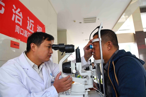 11月8日是記者節(jié)。為了讓奔波在新聞戰(zhàn)線,熬夜趕稿、組版的編輯記者眼睛更健康,11月5日,周口愛爾眼科醫(yī)院的醫(yī)生將儀器搬到周口報業(yè)傳媒集團(tuán),現(xiàn)場為編輯記者檢查眼睛,關(guān)愛新聞工作者的身心健康。圖為眼科醫(yī)生為記者檢查視力、實施治療。記者 劉俊濤 梁照曾 攝