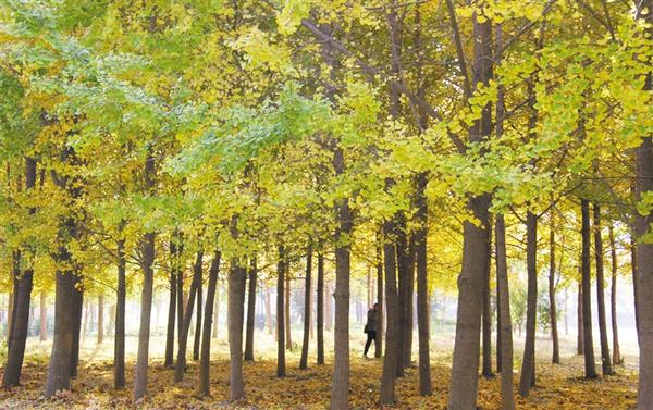 近日,周口市經(jīng)濟(jì)開發(fā)區(qū)人民廣場(chǎng),金黃色的楊樹葉在陽(yáng)光照耀下熠熠生輝,給城市增添一抹亮色。張振海 攝