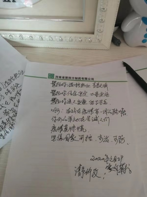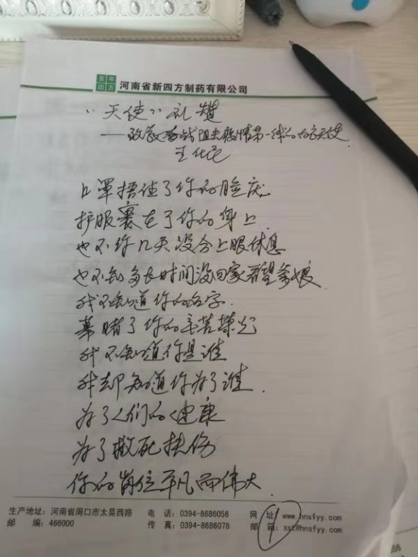 “阻擊疫情的陣容里你默默奉獻(xiàn)著熱和光你舍棄小家 顧著大家 心似蓮花 情滿海洋”1月30日,50多歲愛好寫詩的周口市民王化民致電記者,為了表達(dá)對奮戰(zhàn)在疫情一線白衣天使的崇敬,他特意寫了一首詩歌來禮贊。