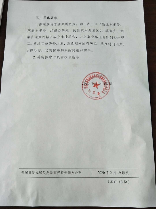 1.按照屬地管理原則負責,由三辦一區(qū)(新城辦事處、洺北辦事處、洺南辦事處、高新技術開發(fā)區(qū))、城郊鄉(xiāng)、胡集鄉(xiāng)通知到轄區(qū)各企事業(yè)單位,各企事業(yè)單位通知到全體職工。要求實施藥物消毒,消毒期間所有居民、單位封門閉戶,不得外出。切實保障群眾的健康和安全。