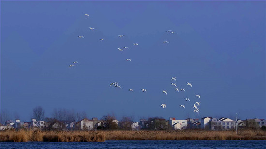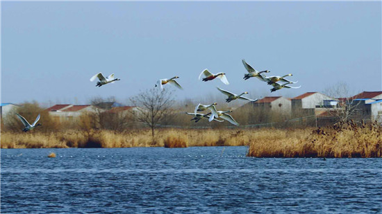 據(jù)在淮陽龍湖北岸疫情卡點(diǎn)值守的安保人員王寶峰介紹,除了這一批50多只白天鵝來龍湖歇腳外,幾天前的2月18日,還有100多只白天鵝在太昊陵前廣場上空盤旋一圈后飛到了龍湖,在龍湖停留一天后向北方遷徙了。