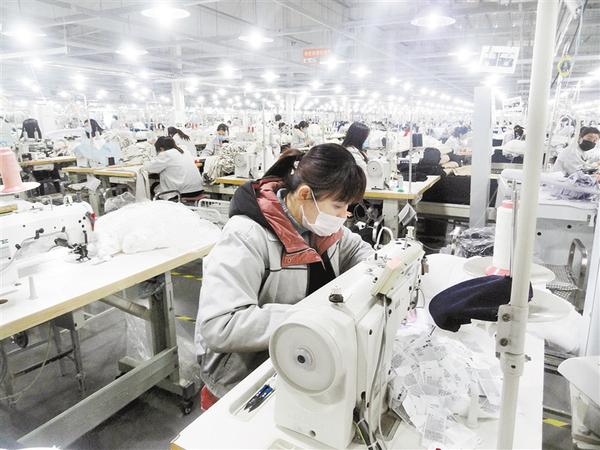 2月26日,商水縣阿爾本制衣有限公司的員工正在生產(chǎn)車(chē)間加工服裝。商水縣在嚴(yán)格做好疫情防控的同時(shí),又做好企業(yè)復(fù)工復(fù)產(chǎn)工作。目前,該縣10家大型企業(yè)和6個(gè)扶貧車(chē)間有返崗人員3萬(wàn)多人。喬連軍攝