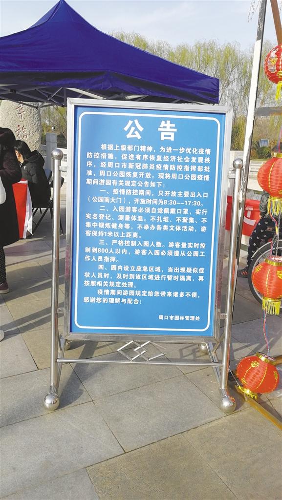 當(dāng)日上午10時許,記者在周口公園看到,在南門入口處的醒目位置,擺放著一個公告牌,寫有入園須知,上面顯示疫情防控期間的開園時間為8:30~17:30,不少游客駐足觀看。入口處,周口市園林管理處疫情防控宣傳臺前的工作人員正忙碌著。游客需間隔1米距離排隊,經(jīng)測量體溫、登記身份證號、雙手噴灑酒精后方可進(jìn)園。雖然入園程序有點繁瑣,但是游客都非常配合。