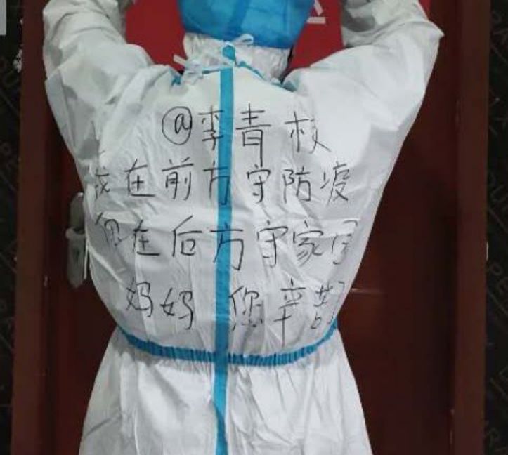 “我在前方守疫,你在后方守家園”,李慧在防護(hù)服上寫(xiě)下感謝媽媽的話,心疼婆婆幫忙照顧孩子。
